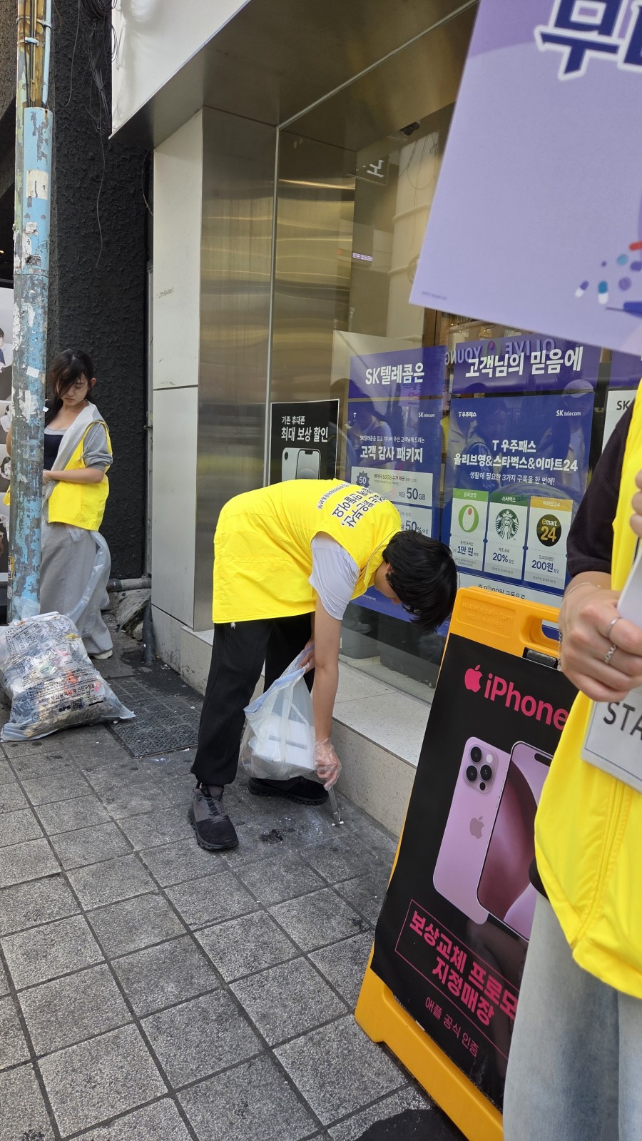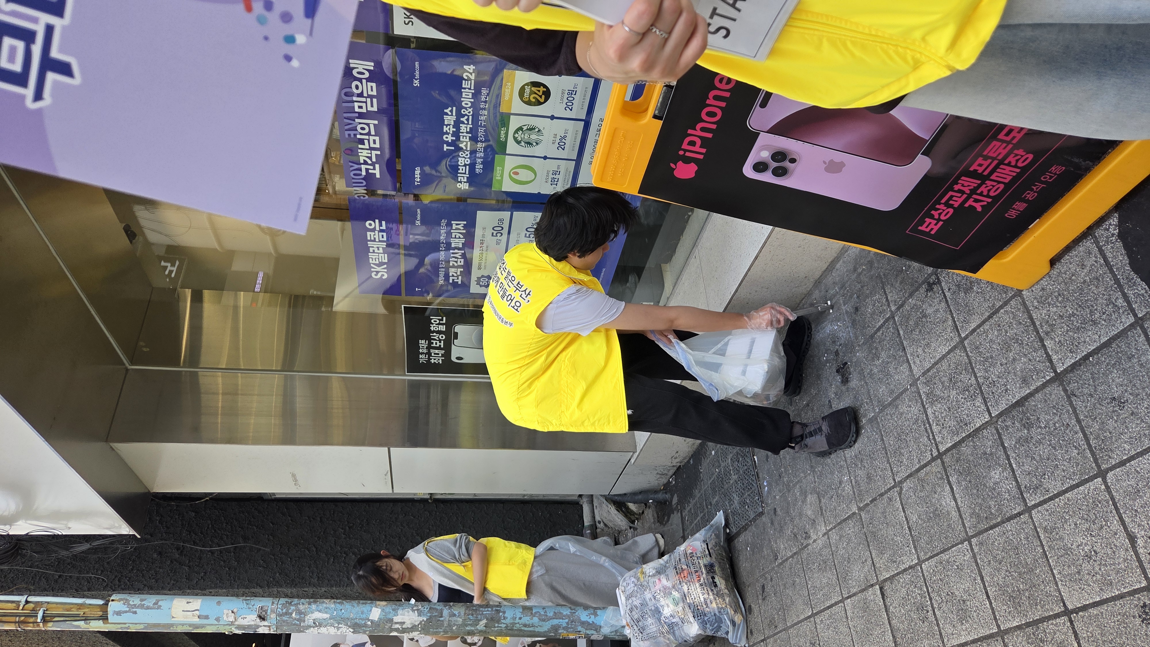처음엔 깨끗해 보이던 거리였는데 막상 자세히 보니 담배꽁초가 정말 많았어요. 다같이 청소하고 나니 거리 색깔이 달라진 느낌이었어요. 마약퇴치 문구가 적힌 깃발을 보며 마음속으로 다짐했습니다.